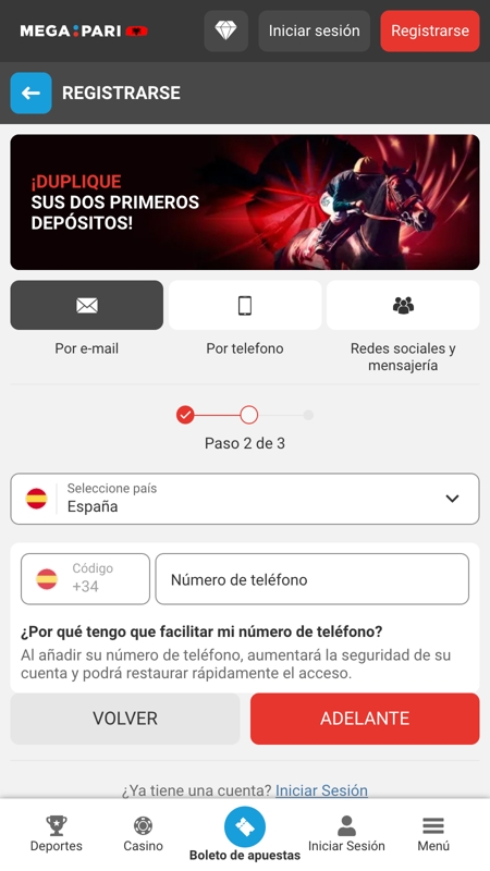 Megapari cuenta apps móviles para Android (APK) e iOS. Además ofrece versión web, que funciona perfecto para acceder del el navegador del teléfono o tablet.