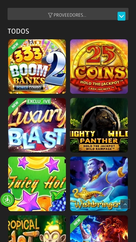 Como ya mencionamos anteriormente, este casino online dispone de un catálogo completo con juegos de casino y casino en vivo. A pesar de tener una variedad importante, encontrarás los juegos fácilmente a través del buscador, donde podrás filtrar por juegos de mesa, los más populares, casino en vivo, video póker y juegos de cartas.